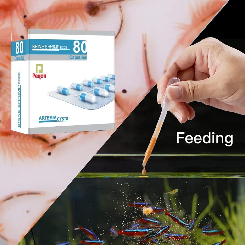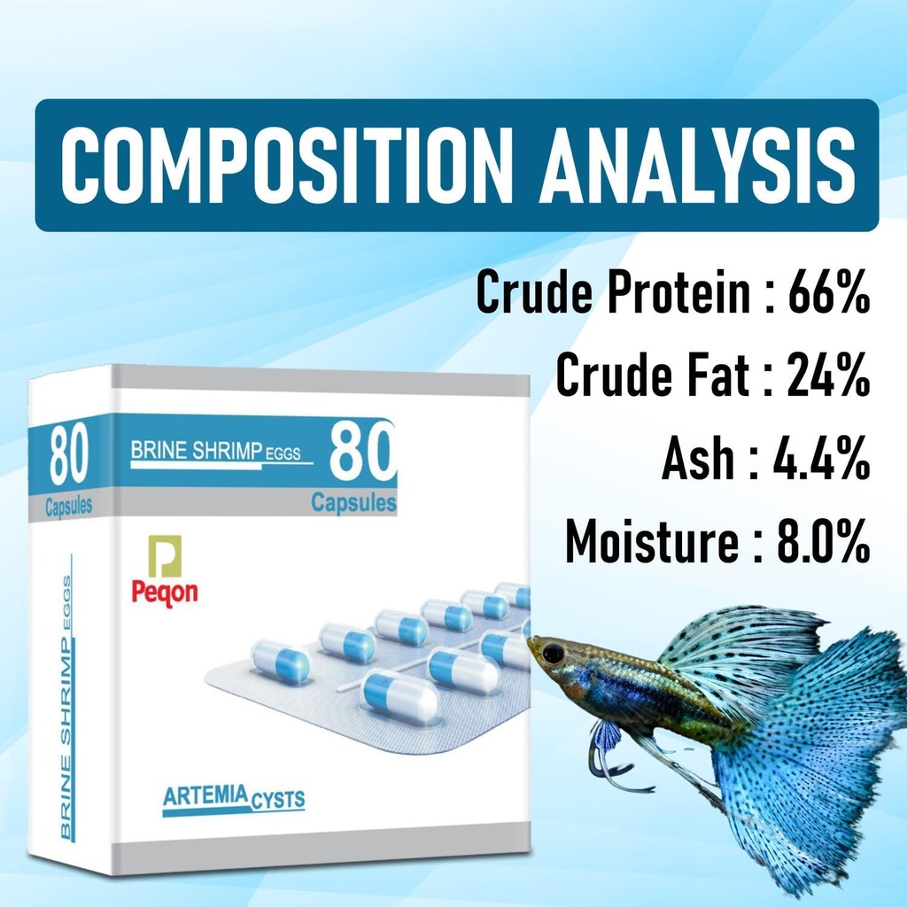 Pegon Artemia Cyst Blue Ring 10 CapsulesArtemia Cysts (Brine Shrimp Eggs) are harvested from salt concentrative pounds or salt lakes. Nauplii hatched from the cysts provide one of nature’s finest nutritious foods for tiny shrimp and fish. Hatching Instructions: 1. Use a clear plastic or glass bottle for small quantities. For larger quantities use a 10-55 gal. (38208 L) fibreglass tank. 2. Use clean sea water or artificial salt water with a specific gravity of 1.01 to 1.02. 3. The optimum pH is 7.5-8.5. If necessary, add an alkaline solution made from soda ash or sodium sulfate to raise the pH. 4. During hatching, use sufficient aeration to keep all eggs in circulation at all times. 5. The optimum hatching temperature is 28-300C.