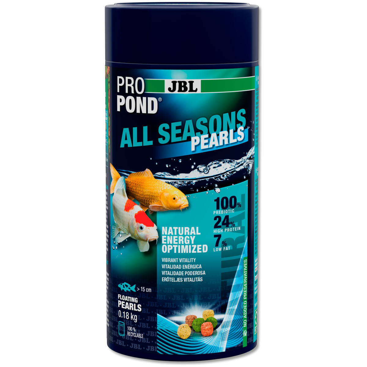 Flake feeding is not possible when feeding with an automatic feeder (JBL PROPOND AUTOFOOD). The term “Natural energy-optimised nutrition” refers to the ratio of proteins to fats in the food. If the seasons alone were taken into account, fish would need half as much protein in winter (2:1) as in summer (4:1). However, it is not only the season and water temperature that play a decisive role, but also the size and age of the fish, as well as the function of the food (e.g. growth food). All these factors were taken into account when developing the JBL food
