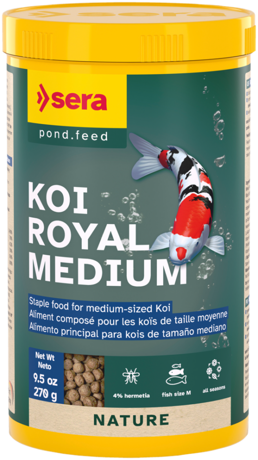 Staple food for balanced growth of Koi between 12 and 25 cm (5 – 10 in.) sera Koi Royal Medium (4 mm/0.15 in.) is the staple food consisting of carefully processed granules for all Koi.