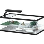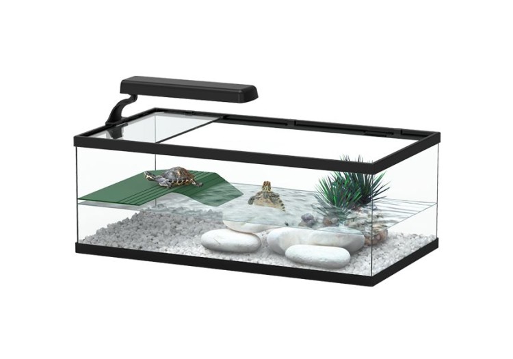 Dimensions : 55x30x20 cm. The TORTUM tanks are especially designed for turtles and includes all the necessary elements for creating a balanced habitat. It’s made in glass and have a protective glass lid on top. They also include a ramp so that